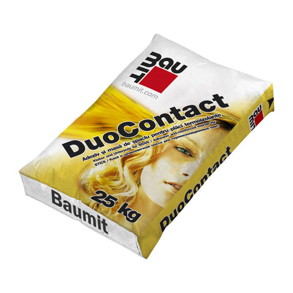 ✅ Baumit Duo Contact este un adeziv mineral multifuncțional pe bază de ciment, cu adaosuri minerale și aditivi speciali, conceput pentru lipirea plăcilor termoizolante din polistiren expandat/extrudat și vată minerală, precum și pentru realizarea stratului de șpaclu armat cu plasă din fibră de sticlă. Produsul oferă aderență ridicată, rezistență mecanică și durabilitate în cadrul sistemelor termoizolante ETICS.