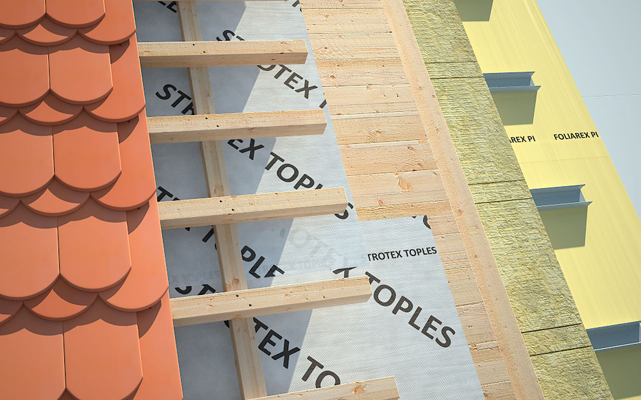 Folia anticondens Foliarex Toples este o membrană de difuzie destinată protecției acoperișurilor, având rolul de a prelua și evacua condensul format sub învelitoare, prevenind astfel deteriorarea termoizolației și apariția igrasiei.